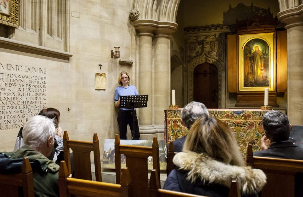 Dr Elena Cooper giving a talk in the Keble side chapel entitled “Art and Copyright in the Nineteenth Century: A talk before Hunt’s The Light of the World”. Photograph by Susanna Brunetti.
